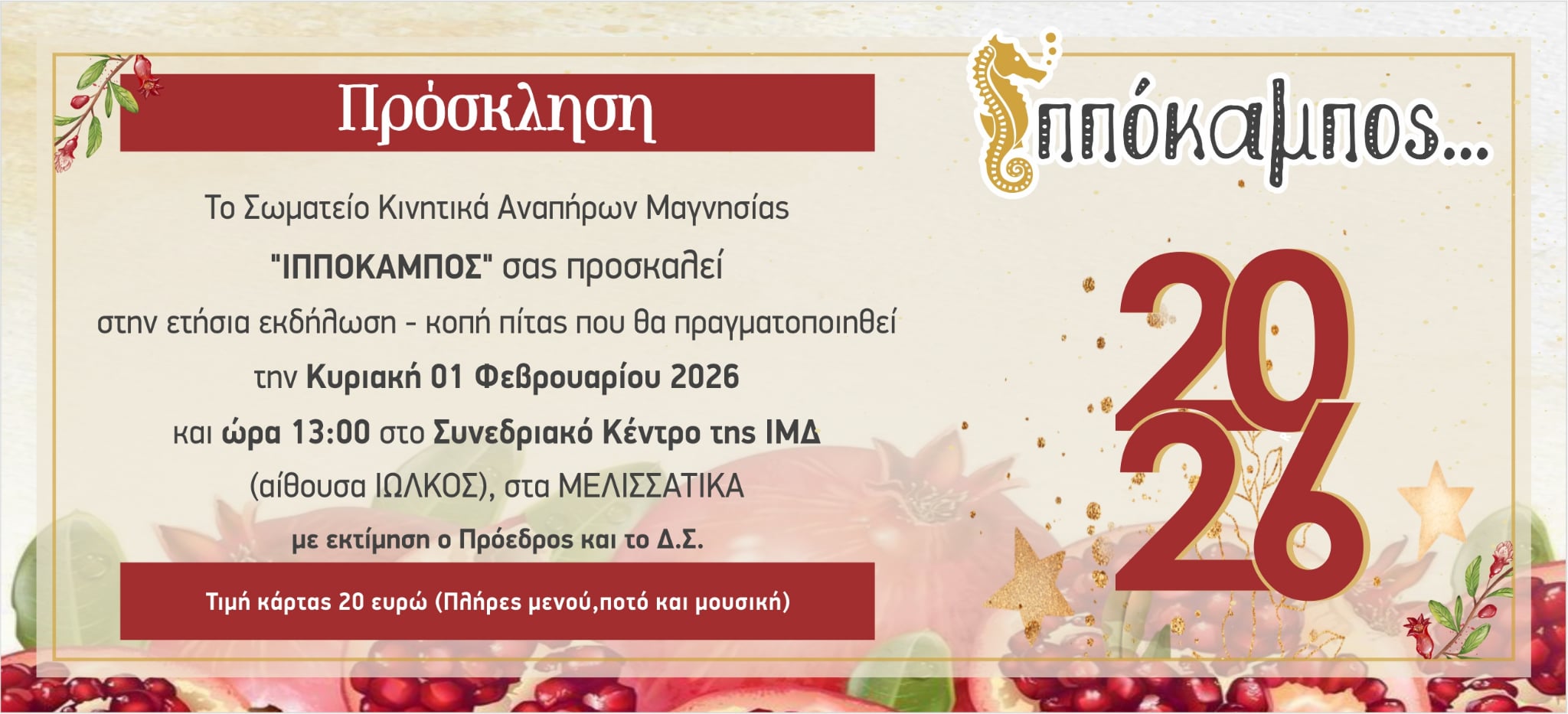Εκδήλωση για τη κοπή της πρωτοχρονιάτικης πίτας του πραγματοποιεί το Σωματείο Κινητικά Αναπήρων Μαγνησίας «Ιππόκαμπος» την Κυριακή 1 Φεβρουαρίου στις 13:00 στο Συνεδριακό Κέντρο της Ιεράς Μητρόπολης Δημητριάδος (αίθουσα Ιωλκός) στα Μελισσιάτικα.