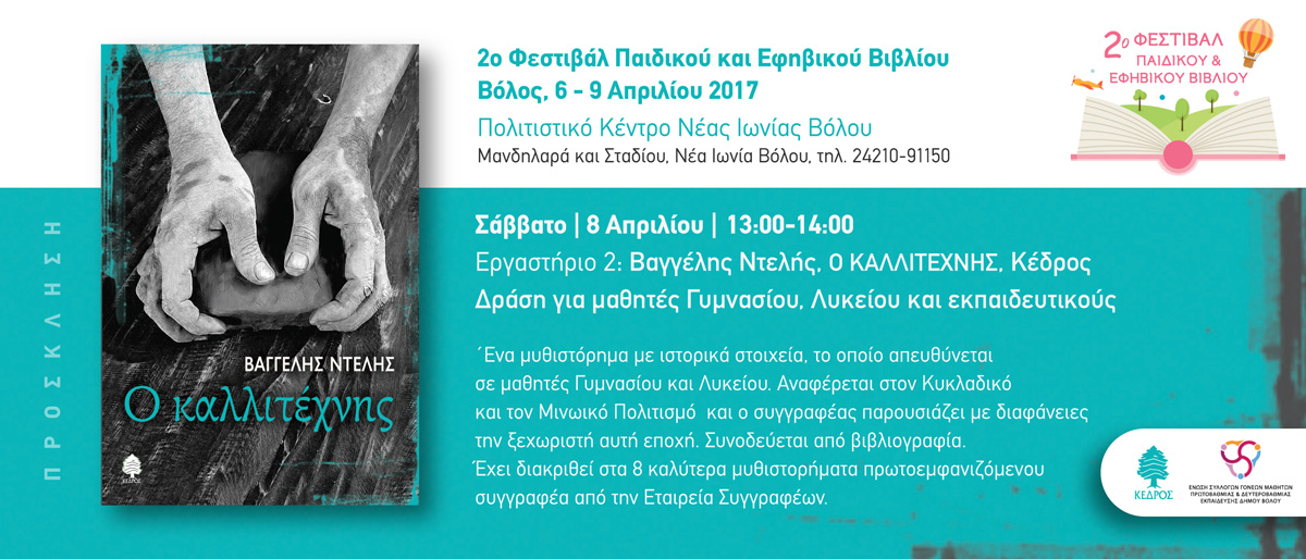 Σάββατο 8 Απριλίου 2017 από τις 13.00-14.00 Εργαστήριο 2: Βαγγέλης Ντελής, «Ο καλλιτέχνης », Κέδρος. Δράση για μαθητές Γυμνασίου- Λυκείου αλλά και εκπαιδευτικούς.