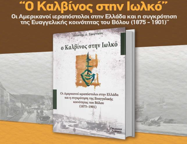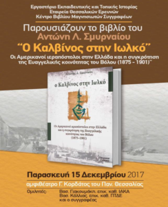 Το Εργαστήριο Εκπαιδευτικής και Τοπικής Ιστορίας του ΠΤΔΕ, η Εταιρεία Θεσσαλικών Ερευνών και το Κέντρο Βιβλίου Μαγνησιωτών Συγγραφέων διοργανώνουν την Παρασκευή 15 Δεκ. 2017 και ώρα 7 μ.μ. στο Αμφιθ. Γ. Κορδάτος του Παν. Θεσσαλίας την παρουσίαση του βιβλίου του Αντώνη Λ. Σμυρναίου, επικ. καθ. ΠΤΔΕ, «Ο Καλβίνος στην Ιωλκό: Οι Αμερικανοί ιεραπόστολοι στην Ελλάδα και η συγκρότηση της Ευαγγελικής Κοινότητας του Βόλου (1875-1901)» [Αθήνα: εκδ. Γρηγόρη, 2017, σ. 316]