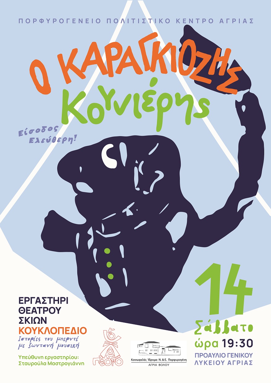 “Ακούσατε, ακούσατε! Παράσταση Καραγκιόζη από το Εργαστήρι Θεάτρου Σκιών του Πορφυρογένειου Ιδρύματος Αγριάς”! Τα παιδιά του εργαστηρίου ΚΟΥΚΛΟΠΕΔΙΟ παρουσιάζουν τη νέα τους παράσταση «Ο Καραγκιόζης Κουνιέρης», το Σάββατο 14 Σεπτεμβρίου, στις 19:30, στον προαύλιο χώρο του Γενικού Λυκείου Αγριάς.
