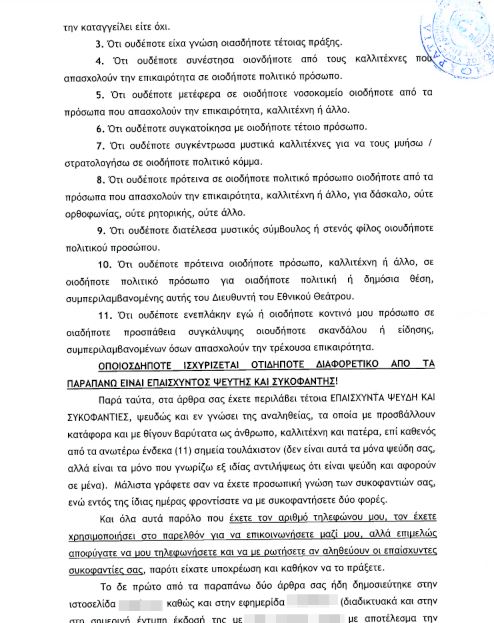 Ότι ουδέποτε πρότεινα οποιοδήποτε πρόσωπο καλλιτέχνη ή άλλο σε οιοδήποτε πολιτικό πρόσωπο για οιοδήποτε δημόσια ή πολιτική θέση, συμπεριλαμβανομένης αυτής του διευθυντή του Εθνικού Θεάτρου