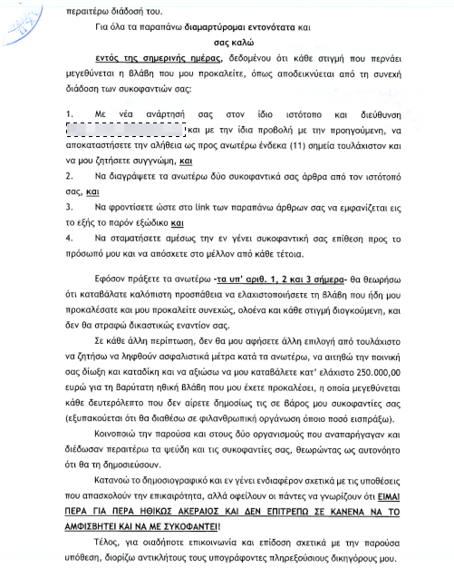 Στο εξώδικο, ο Κωνσταντίνος Μαρκουλάκης σημειώνει ότι η αναμφισβήτητη και μοναδική αλήθεια είναι: