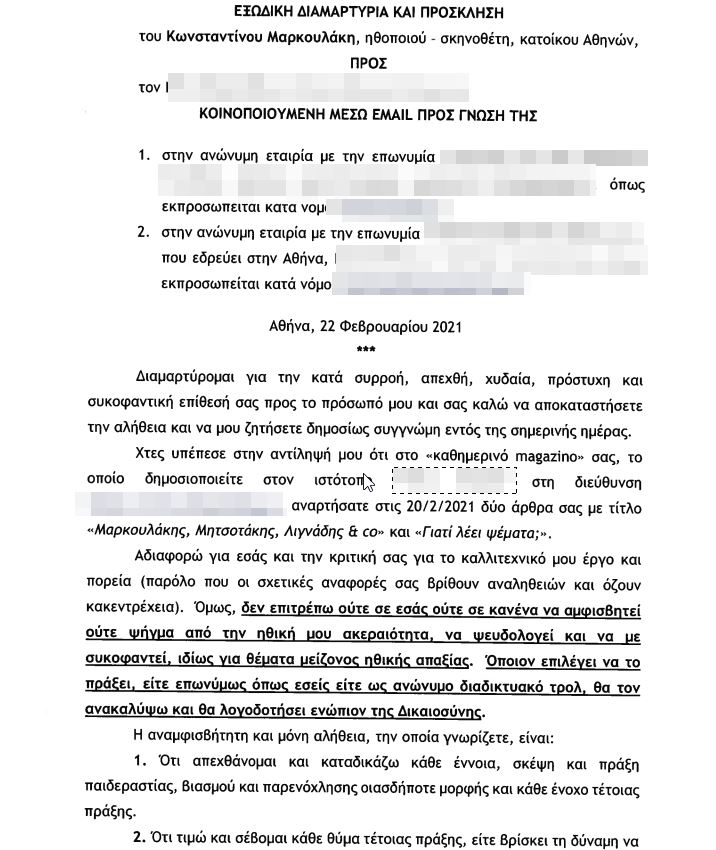 Γράφει χαρακτηριστικά ο Κωνσταντίνος Μαρκουλάκης, ότι ενώ οι δημοσιογράφοι των μέσων αυτών είχαν το τηλέφωνό του, δεν επικοινώνησαν μαζί του για να επιβεβαιώσουν αυτό που επρόκειτο να γράψουν. Προχώρησε λοιπόν στην αποστολή εξωδίκων, ζητώντας να κατέβουν τα σχετικά κείμενα και στη θέση τους να εμφανίζεται με link το εξώδικο. Διαφορετικά, θα ζητήσει ασφαλιστικά μέτρα, άσκηση ποινικής δίωξης και καταδίκης, και χρηματική αποζημίωση.