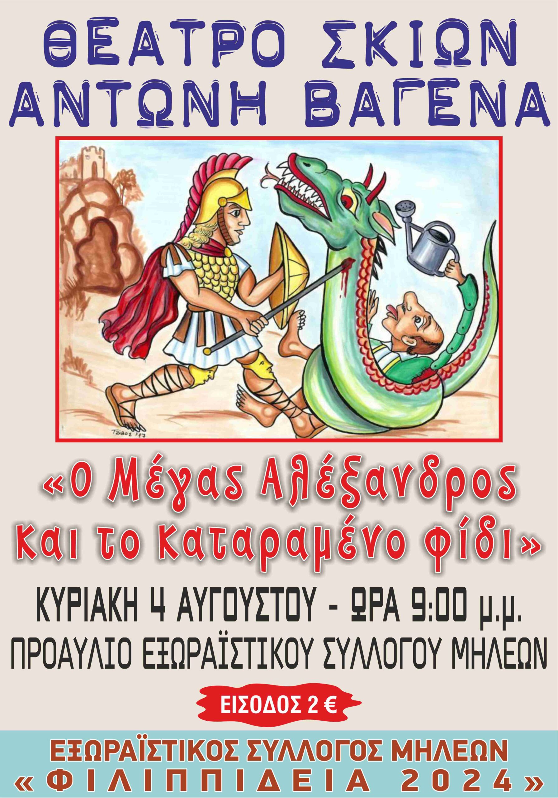 Το Θέατρο Σκιών Αντώνη Βαγενά παρουσιάζει την παράσταση «Ο Μέγας Αλέξανδρος και το καταραμένο φίδι» την Κυριακή 4 Αυγούστου στις 9μ.μ. στο προαύλιο του Εξωραϊστικού Συλλόγου Μηλεών, στο πλαίσιο των εκδηλώσεων «Φιλιππίδεια 2024».