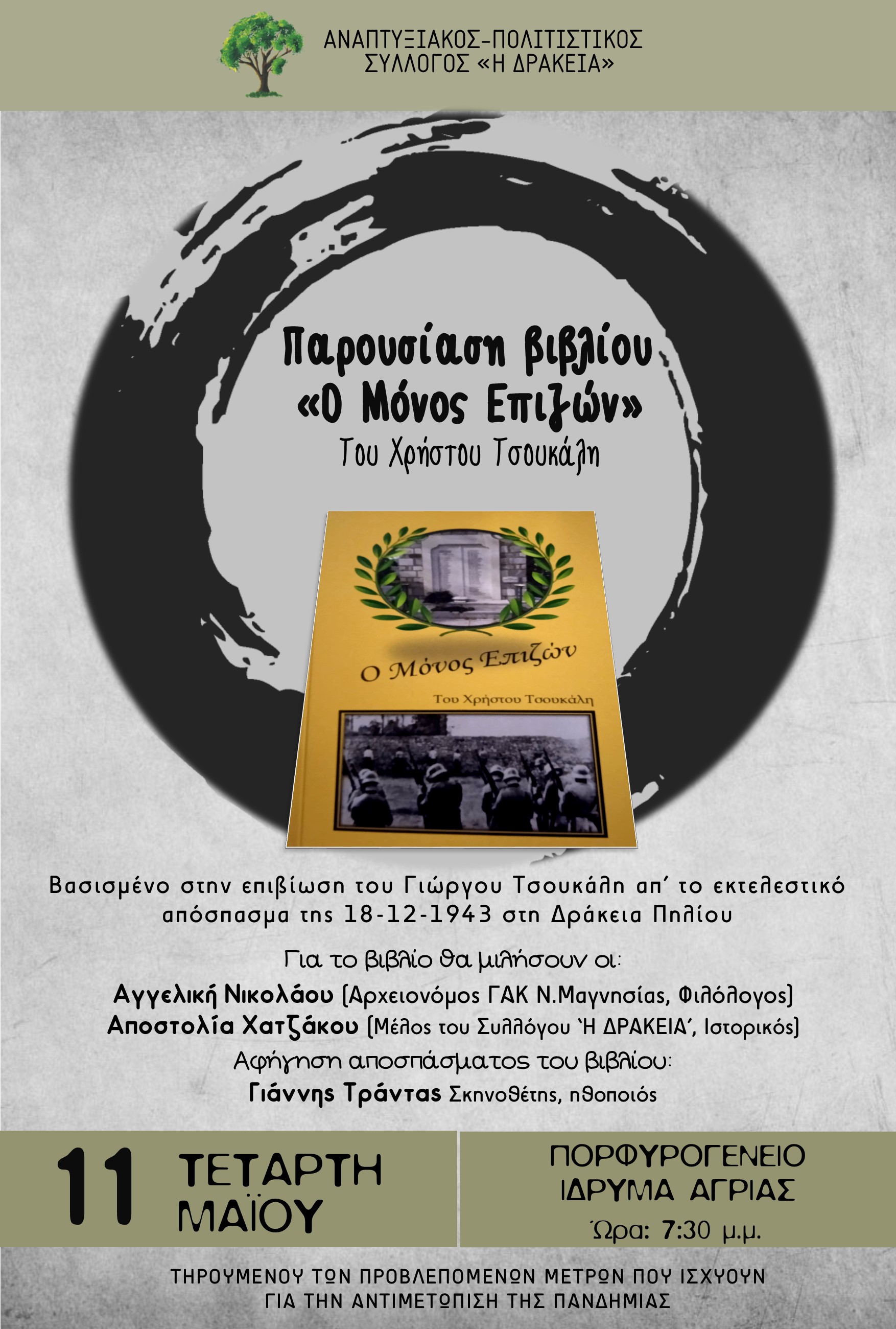 Ο Αναπτυξιακός-Πολιτιστικός Σύλλογος «Η ΔΡΑΚΕΙΑ» παρουσιάζει το βιβλίο του Χρήστου Τσουκάλη με τίτλο «Ο μόνος επιζών», στο Πορφυρογένειο Ίδρυμα Αγριάς, αύριο, Τετάρτη 11 Μαΐου στις 7:30 μ.μ. Το βιβλίο είναι βασισμένο στην επιβίωση του Γιώργου Τσουκάλη απ’ το ολοκαύτωμα της Δράκειας, όπου 115 ενήλικες άνδρες έχασαν τη ζωή τους από τα γερμανικά στρατεύματα κατοχής.