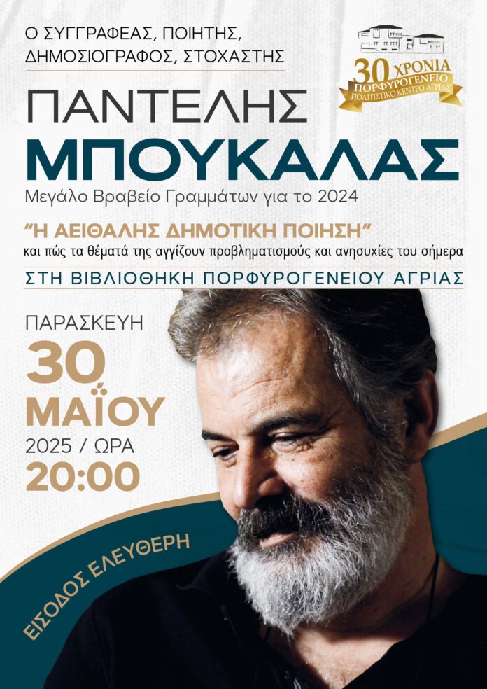 Όπως αναφέρεται σε σχετική ανακοίνωση, «στο Πορφυρογένειο Πολιτιστικό Κέντρο Αγριάς θεωρούμε εξαιρετική τιμή το γεγονός ότι ο κ. Μπουκάλας θα βρίσκεται κοντά μας την Παρασκευή 30 Μαΐου για μια κουβέντα με το κοινό που θα ξεκινά από τη δημοτική ποίηση και το τραγούδι, ένα πεδίο έρευνας που τον απασχολεί διαχρονικά, για να συνεχιστεί σε κάθε τι σχετικό με τη γλώσσα, τα γράμματα, κοινωνικά ζητήματα και όποιο άλλο θέμα του καιρού μας.
