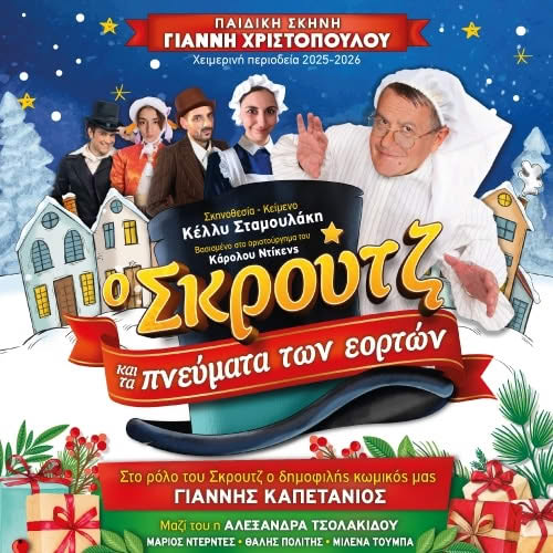 Η παιδική σκηνή του Γιάννη Χριστόπουλου παρουσιάζει την επιτυχημένη θεατρική παράσταση «Ο Σκρούτζ και τα πνεύματα των εορτών» αύριο Σάββατο 29 Νοεμβρίου στο Πολιτιστικό Κέντρο Ν. Ιωνίας με δύο παραστάσεις στις 17:00 και στις 19:00, που είναι βασισμένη στο γνωστό έργο του Καρόλου Ντίκενς «Μια Χριστουγεννιάτικη Ιστορία».