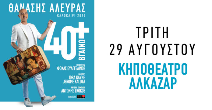 Ο συναρπαστικός Θανάσης Αλευράς την Τρίτη 29 Αυγούστου σταθμεύει στη Λάρισα, στο Κηποθέατρο Αλκαζάρ, στην πρώτη του καλοκαιρινή περιοδεία με την προσωπική του μουσικοθεατρική παράσταση «40+ βγαίνω» που γνώρισε τεράστια επιτυχία!