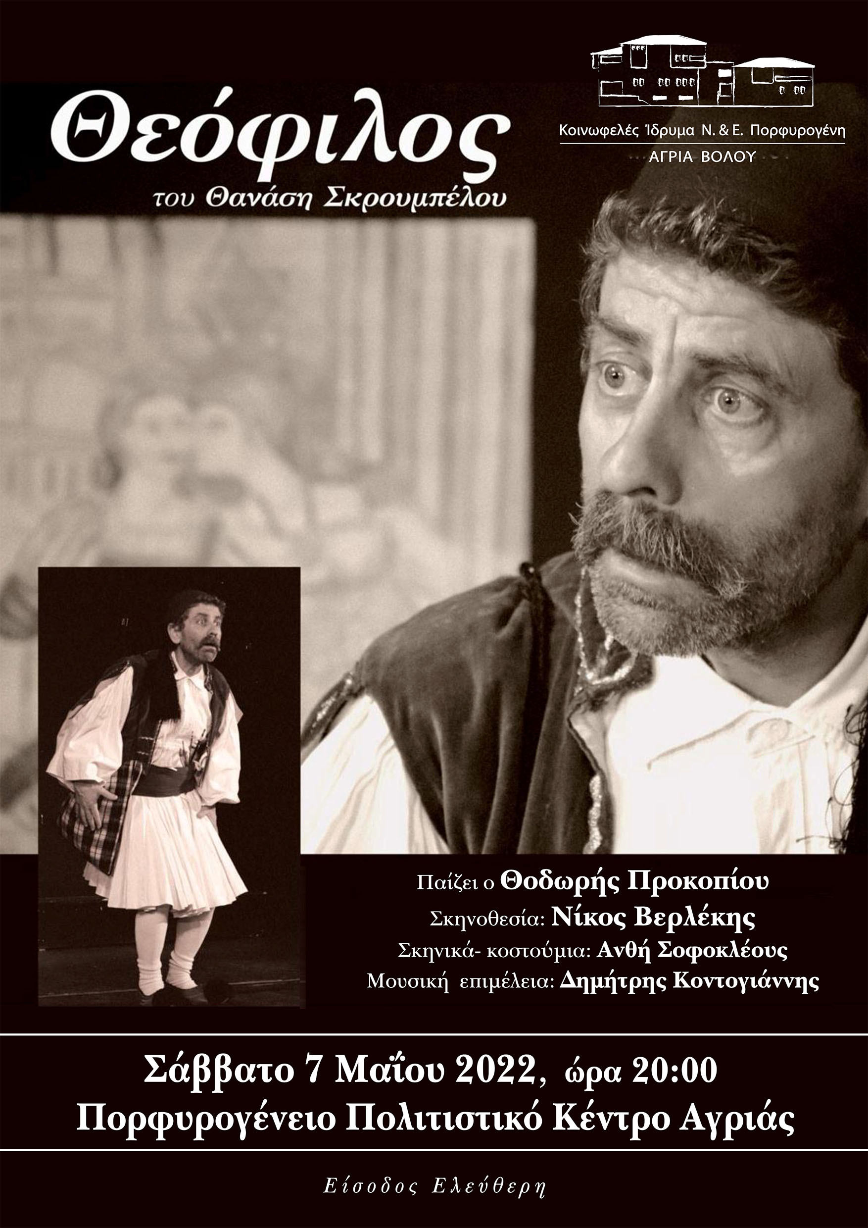 Ο «ΘΕΟΦΙΛΟΣ», το θεατρικό έργο του Θανάση Σκρουμπέλου, με τον Θοδωρή Προκοπίου, σε σκηνοθεσία Νίκου Βερλέκη επιστρέφει και σήμερα, “πάντα θα επιστρέφει….”. Η παράσταση που παρουσιάστηκε για τρεις συνεχόμενες επιτυχημένες θεατρικές σαιζόν, και κέρδισε το κοινό σε Αθήνα και σε άλλα μέρη της Ελλάδας, θα παρουσιαστεί το Σάββατο 7 Μαΐου, ώρα 20.00 στο Πορφυρογένειο Αγριάς, για το κοινό του τόπου μας, εδώ που έζησε και δημιούργησε ο σπουδαίος λαϊκός ζωγράφος.