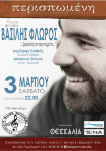 Δουλεύοντας το υλικό του καινούργιου προσωπικού του δίσκου, του οποίου σύντομα αναμένεται η κυκλοφορία, ο τραγουδοποιός Βασίλης Φλώρος και η εξαιρετική μουσική του παρέα, συνεχίζουν τον πετυχημένο κύκλο των ζωντανών τους εμφανίσεων, επιστρέφοντας στην πόλη του Βόλου, στον πάντα ξεχωριστό και φιλόξενο χώρο εικαστικής έκφρασης και δημιουργίας, την Περισπωμένη, για μία και μοναδική βραδιά, το Σάββατο 3 Μαρτίου.