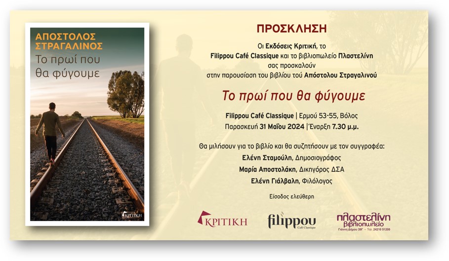 Το βιβλίο του Απόστολου Στραγαλινού με τίτλο «Το πρωί που θα φύγουμε» θα παρουσιαστεί στον Βόλο την Παρασκευή 31 Μαΐου στις 7.30 το απόγευμα στο filippou Café (Ερμού 53 – 55 ) με τη διοργάνωση των εκδόσεων «Κριτική», του Filippou Café Classique και του βιβλιοπωλείου «Πλαστελίνη». Για το βιβλίο και τον συγγραφέα θα μιλήσουν : Ελένη Σταμούλη – δημοσιογράφος, Μαρία Αποστολάκη – Δικηγόρος Δ.Σ.Α., Ελένη Γιάλβαλη – φιλόλογος.