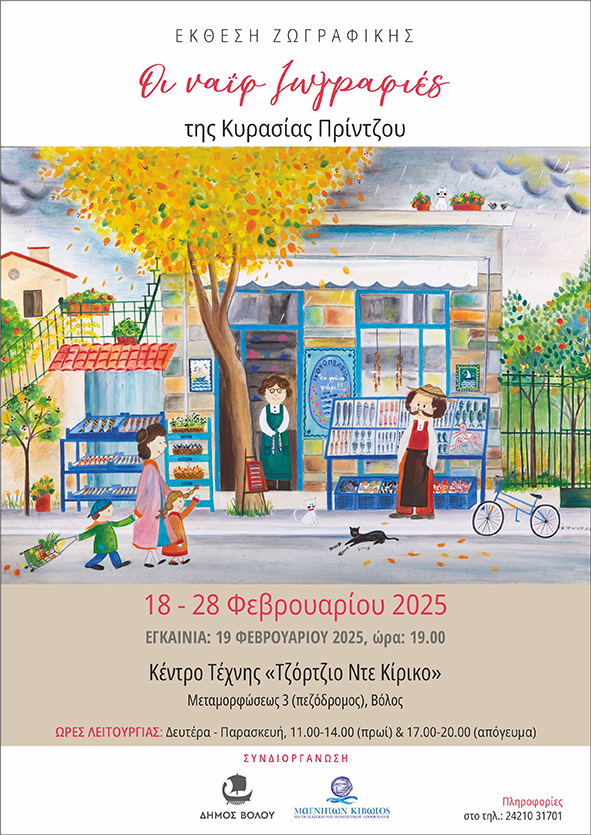 Ο φορέας πολιτισμού της Ιεράς Μητροπόλεως Δημητριάδος και Αλμυρού «Μαγνήτων Κιβωτός, για την διάσωση του πολιτιστικού αποθέματος», με τη συμπλήρωση των 10 ετών από την ίδρυση του και την αρωγή της Αντιδημαρχίας Πολιτισμού και Μουσείων του Δήμου Βόλου, διοργανώνει την έκθεση «Οι ναΐφ ζωγραφιές της Κυρασίας Πρίντζου» στην Αίθουσα Εκθέσεων του Κέντρου Τέχνης «Τζόρτζιο Ντε Κίρικο», από την Τρίτη 18 έως και την Παρασκευή 28 Φεβρουαρίου. Τα εγκαίνια της έκθεσης θα πραγματοποιηθούν την Τετάρτη 19 Φεβρουαρίου και ώρα 19:00 από τονΜητροπολίτη Δημητριάδος και Αλμυρού και Πρόεδρο του φορέα πολιτισμού «Μαγνήτων Κιβωτός» κ. κ. Ιγνάτιο.