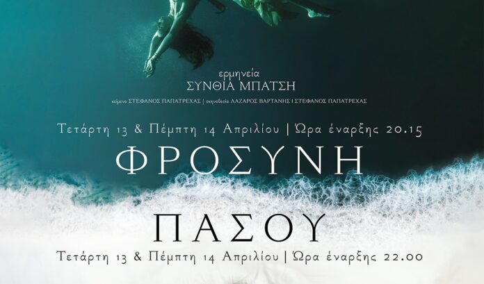 Στην παράσταση «Φροσύνη» ακούγεται η φωνή του Αιμίλιου Χειλάκη. Στην παράσταση «Πασού» ακούγεται η φωνή της Λυδίας Φωτοπούλου. Τοποθεσία: LabArt Theater, Πολυχώρος Τσαλαπάτα. Παραστάσεις: Τετάρτη 13 & Πέμπτη 14 Απριλίου 2022. «Φροσύνη» / Ώρα έναρξης: 20.15. Διάρκεια: 60 λεπτά. «Πασού» / Ώρα έναρξης: 22.00. Διάρκεια: 65 λεπτά Πληροφορίες: 6934108666. Τιμή εισιτηρίου για την κάθε παράσταση: €10 Προσφορά εισιτηρίου και για τις δύο παραστάσεις: €14. Προπώληση εισιτηρίων: Viva.gr, Wind, Public, Media Markt, Κεχαΐδης, Illusion.