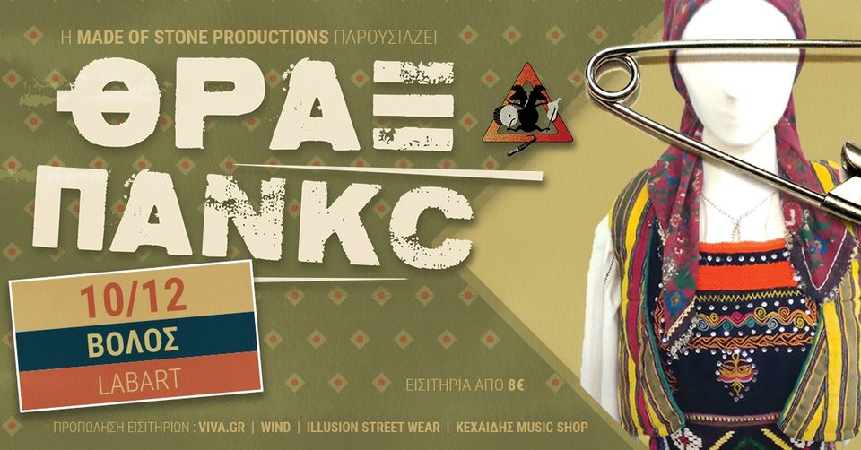 Το ιδιαίτερο συγκρότημα «ΘΡΑΞ ΠΑΝΚC – Thrax Punks» έρχεται στον Βόλο αύριο, Παρασκευή 10 Δεκεμβρίου, στο πλαίσιο της πανελλαδικής περιοδείας τους, στο Lab Art, στον Πολυχώρο Τσαλαπάτα, όπως έχει ανακοινωθεί και έχει δημιουργηθεί και η αντίστοιχη πρόσκληση μέσω της πλατφόρμας του Facebook.