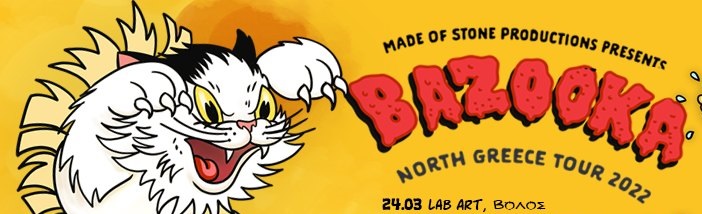 Η Made Of Stone Productions παρουσιάζει τους Βολιώτες BAZOOKA live απόψε Πέμπτη 24 Μαρτίου 2022 στο Lab Art. Τη βραδιά ανοίγουν οι επίσης Βολιώτες psych garage rockers Tenderfeet. Ώρα προσέλευσης 21:00, ώρα έναρξης 22:00. ΤΙΜΕΣ ΕΙΣΙΤΗΡΙΩΝ : — Προπώληση: 8€, Ταμείο : 10€ ΣΗΜΕΙΑ ΠΡΟΠΩΛΗΣΗΣ : viva.gr (πανελλαδικά), καταστήματα Wind (πανελλαδικά), Facebook event page: www.facebook.com/events/309572381207551