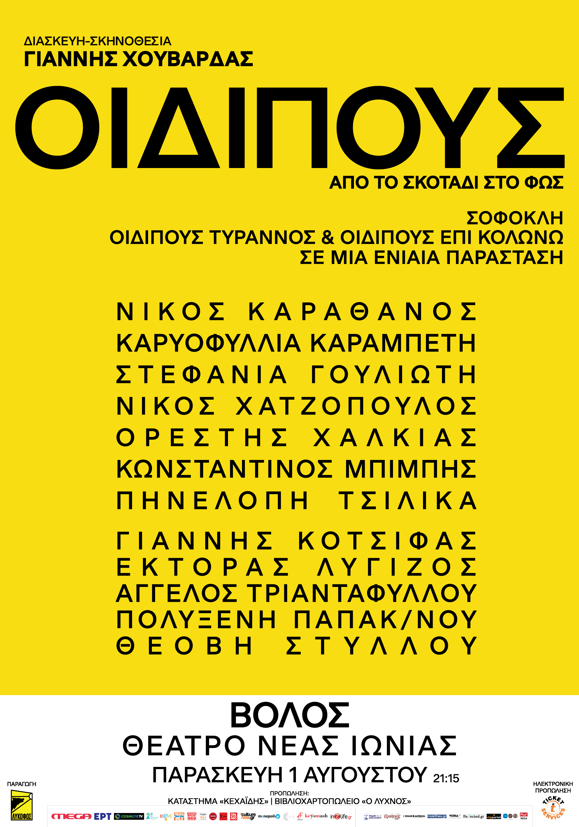 Γιορτάζοντας τα 50 χρόνια συνεχούς επαγγελματικής παρουσίας στο θέατρο, ο σκηνοθέτης Γιάννης Χουβαρδάς μεταφράζει και σκηνοθετεί τον «Οιδίποδα Τύραννο» και τον «Οιδίποδα επί Κολωνώ» σε μια ενιαία παράσταση, και μάλιστα ως ένα έργο. Η παράσταση έρχεται και στον Βόλο την Παρασκευή 1η Αυγούστου και παρουσιάζεται στο Ανοιχτό Θέατρο Ν. Ιωνίας.