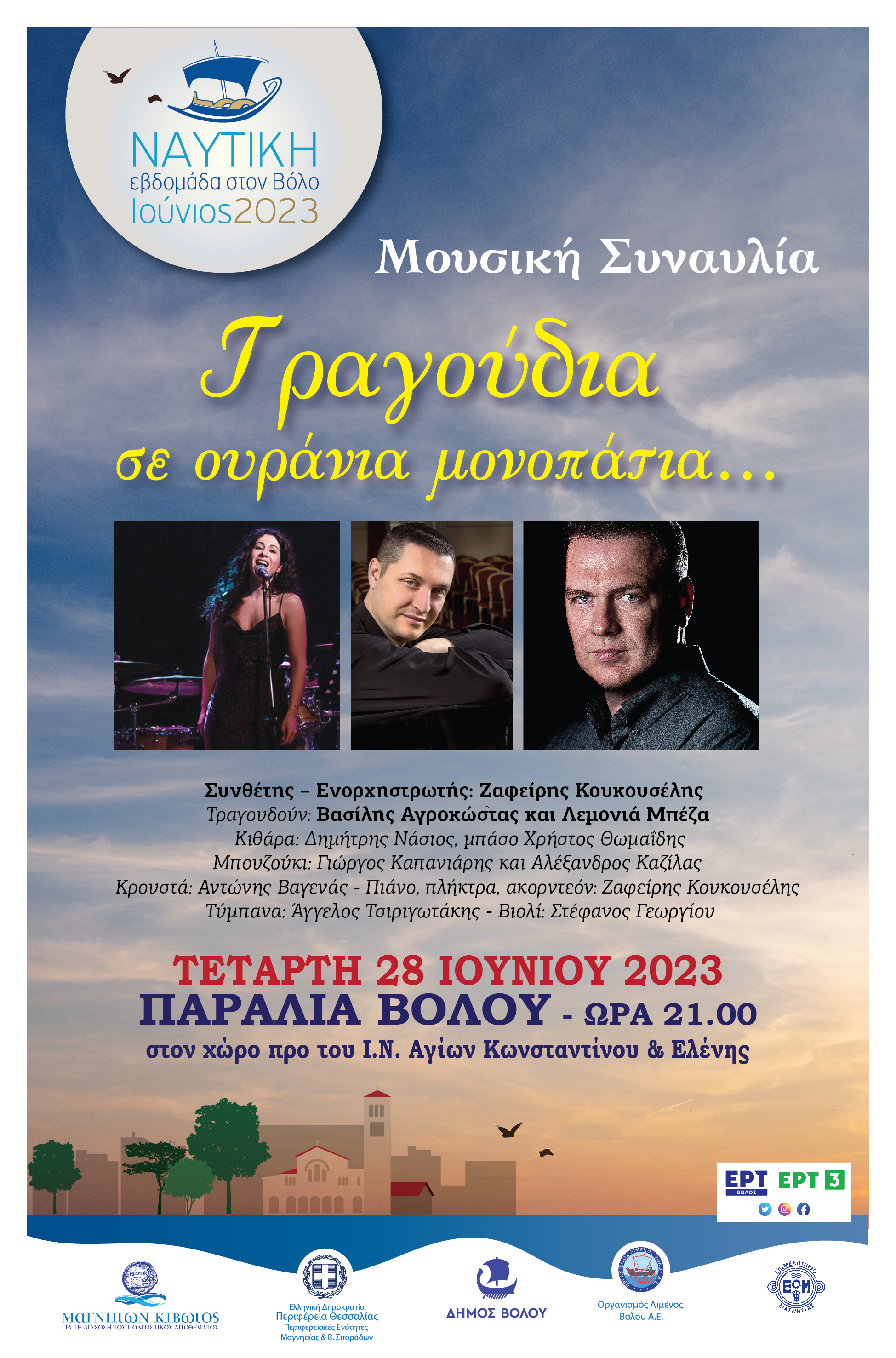 Σήμερα Τετάρτη 28 Ιουνίου 2023, την ίδια πάντα ώρα, ώρα 21.00, στην Παραλία του Βόλου, στον χώρο έμπροσθεν Ιερού Ναού Αγίων Κωνσταντίνου και Ελένης, θα πραγματοποιηθεί μια μοναδική Επετειακή Μουσική Συναυλία, με τίτλο: