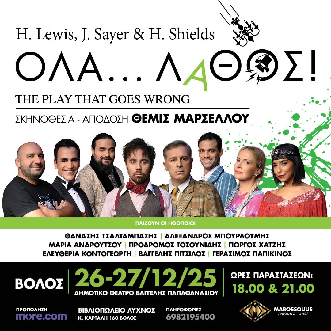 Μετά από έναν εξαιρετικά επιτυχημένο κύκλο sold out παραστάσεων στην Αθήνα και στην Θεσσαλονίκη, η ξεκαρδιστική κωμωδία των Henry Lewis, Jonathan Sayer και Henry Shields «Όλα… λάθος», που έχει κατακτήσει τα βραβεία και τους κριτικούς σε Ευρώπη και Αμερική, έρχεται στον Βόλο με δύο διπλές παραστάσεις την Παρασκευή 26 και το Σάββατο 27 Δεκεμβρίου.