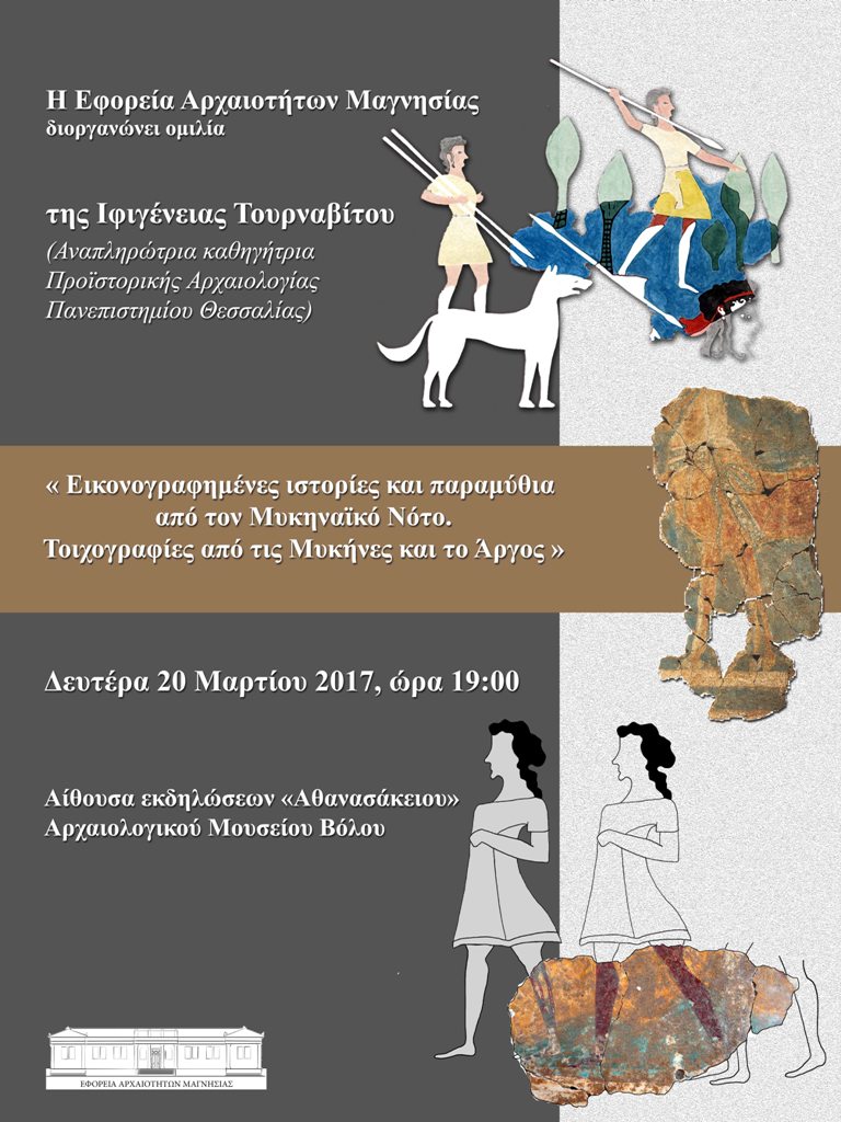 Η Εφορεία Αρχαιοτήτων Μαγνησίας διοργανώνει ομιλία της αναπληρώτριας καθηγήτριας Προϊστορικής Αρχαιολογίας του Πανεπιστημίου Θεσσαλίας κας Ιφιγένειας Τουρναβίτου με τίτλο «Εικονογραφημένες ιστορίες και παραμύθια από τον Μυκηναϊκό Νότο. Τοιχογραφίες από τις Μυκήνες και το Άργος», που θα πραγματοποιηθεί τη Δευτέρα 20 Μαρτίου 2017 και ώρα 19:00 στην Αίθουσα Εκδηλώσεων του «Αθανασάκειου» Αρχαιολογικού Μουσείου Βόλου.