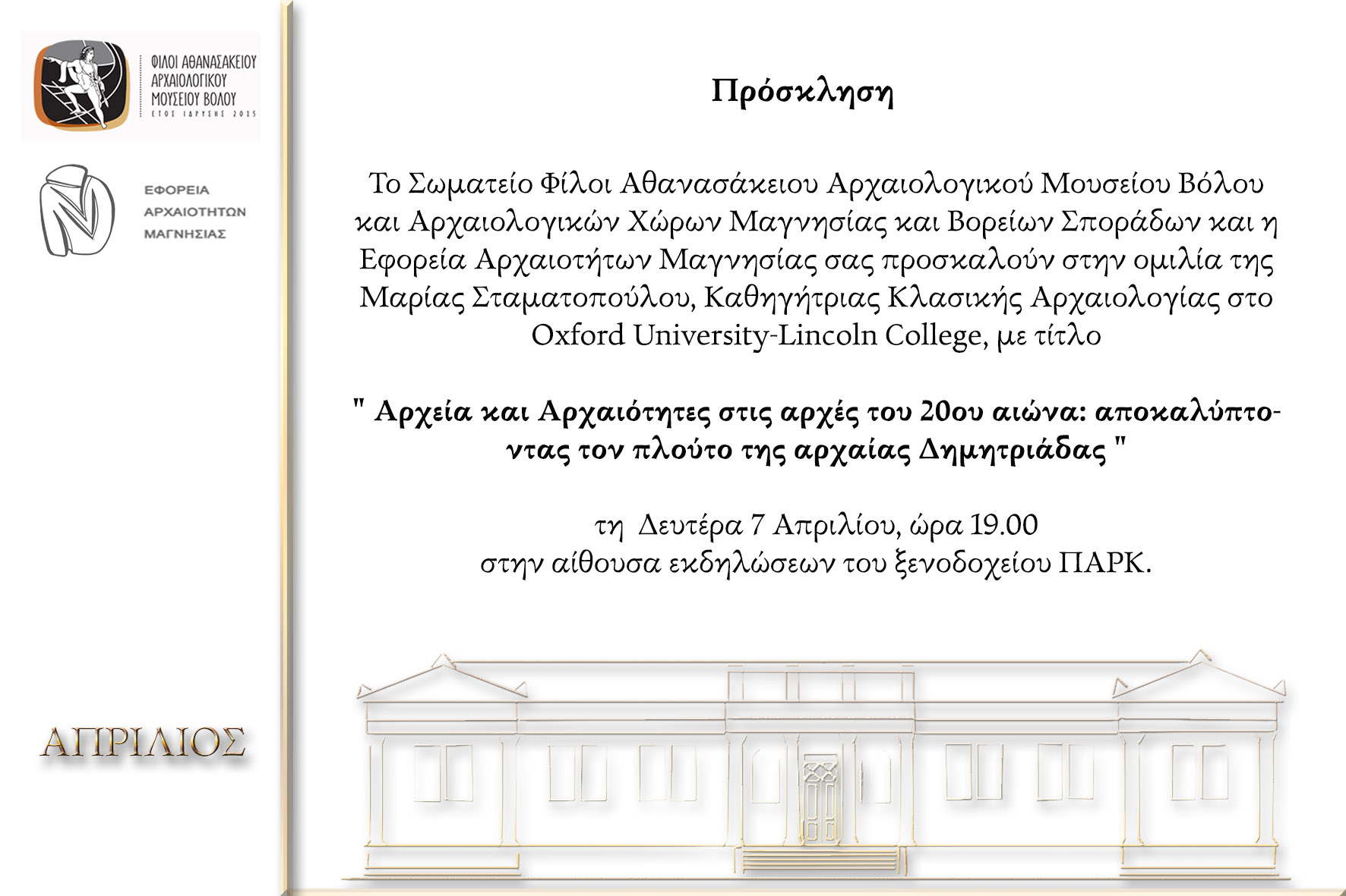 Το Σωματείο Φίλοι Αθανασάκειου Αρχαιολογικού Μουσείου Βόλου και Αρχαιολογικών Χώρων Μαγνησίας και Β. Σποράδων και η Εφορεία Αρχαιοτήτων Μαγνησίας διοργανώνουν την ομιλία της Μαρίας Σταματοπούλου, Καθηγήτριας Κλασικής Αρχαιολογίας στο OxfordUniversity- LincolnCollege με τίτλο «Αρχεία και Αρχαιότητες στις αρχές του 20ου αιώνα: αποκαλύπτοντας τον πλούτο της αρχαίας Δημητριάδας».
