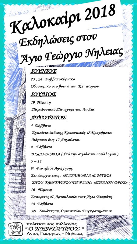 Ο πολιτιστικός και εξωραϊστικός σύλλογος «Ο ΚΕΝΤΑΥΡΟΣ» του Αγίου Γεωργίου Νηλείας , παρουσιάζει μέρος των φετινών καλοκαιρινών εκδηλώσεων 2018 , που θα γίνουν τόσο μέσα στο χωριό – στην γραφική πλατεία και στην διαμορφωμένη αίθουσα εκδηλώσεων – όσο και σε κατάλληλα διαμορφωμένους χώρους και αυλές στα πέριξ του χωριού.