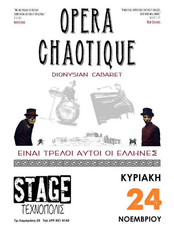 Οι «Opera Chaotique» θα εμφανιστούν στο Τεχνόπολις Stage την Κυριακή 24 Νοεμβρίου. Tιμή εισιτηρίου : 8 ευρώ και οι πόρτες ανοίγουν στις 22.00 Γ. Λαμπράκη 25, Παλιά (Είσοδος από το στενό Γραβιάς). H εκδήλωση τελεί υπό την καλλιτεχνική αιγίδα του «Συλλόγου Φίλων τέχνης και δημιουργίας Τεχνόπολις». «Οι Opera Chaotique με εμφανίσεις σε μεγάλα φεστιβάλ / θέατρα και venues σε 19 χώρες ήδη στα 8 χρόνια πορείας τους και sold out εμφανίσεις σε Λυρική Σκηνή Αθηνών και Μέγαρο Μουσικής Θεσσαλονίκης, καθώς και συνεργασίες με σημαντικούς καλλιτέχνες, έχουν καταφέρει να χαρτογραφηθούν ως ένα απολύτως μοναδικό φαινόμενο του μουσικού στερεώματος».