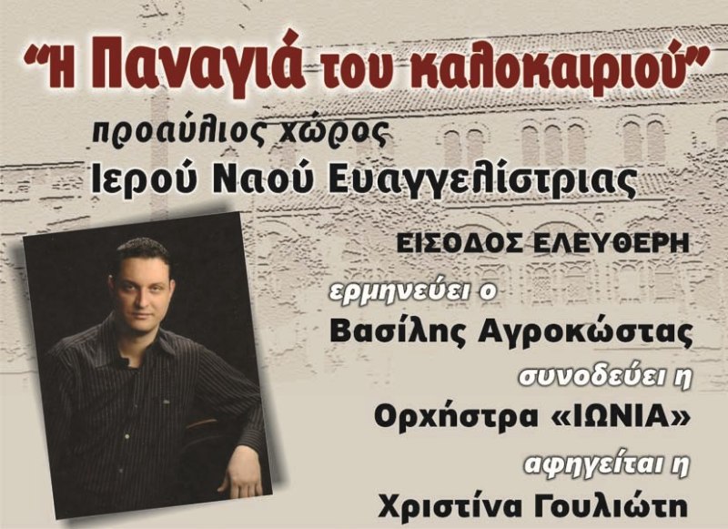 Ο Δήμος Βόλου σε συνεργασία με τη Δημοτική Ενότητα Νέας Ιωνίας διοργανώνει την Τρίτη 9 Αυγούστου και ώρα 20.30 μ.μ. στον προαύλιο χώρο του Ιερού Ναού της Ευαγγελιστρίας, συναυλία με παραδοσιακά τραγούδια με τίτλο: «Παναγιά του καλοκαιριού» με την Ορχήστρα «ΙΩΝΙΑ».