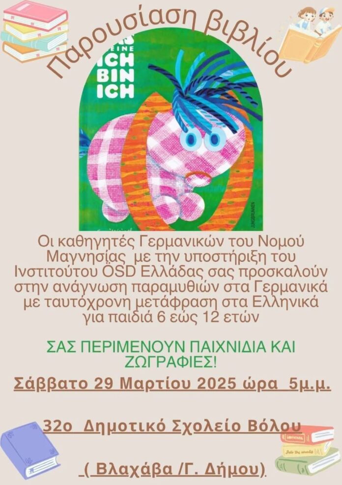 Παραμύθια στα γερμανικά θα αναγνώσουν στο 32ο Δ.Σ. Βόλου, το Σάββατο 29 Μαρτίου στις 5 το απόγευμα.