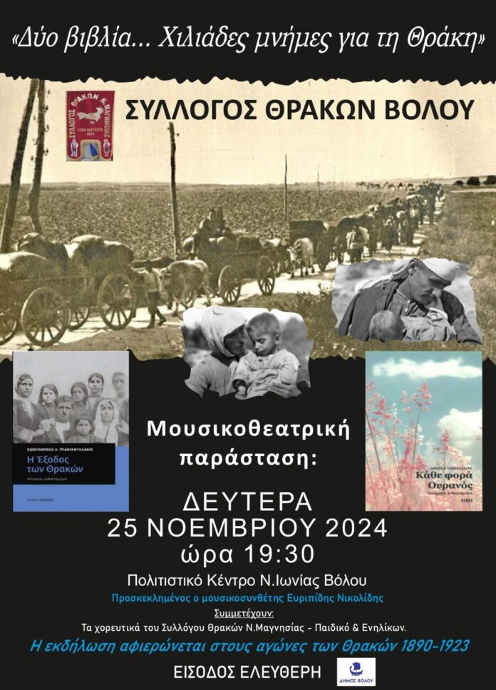 Μουσικοθεατρική παράσταση με τον τίτλο: «Δύο βιβλία… χιλιάδες μνήμες για τη Θράκη» διοργανώνει ο τοπικός σύλλογος Θρακών τη Δευτέρα 25 Νοεμβρίου στις 7.30 στο πολιτιστικό κέντρο Νέας Ιωνίας.
