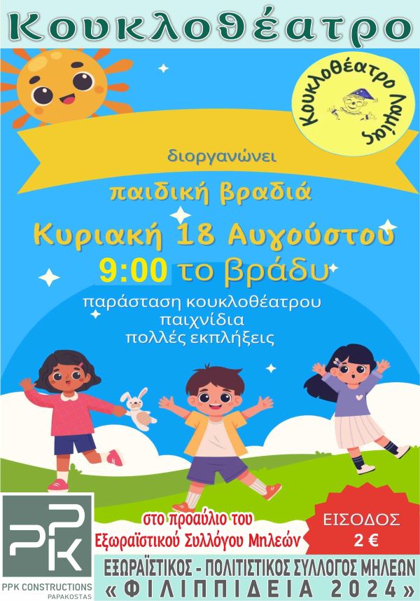 Συνεχίζονται οι πολιτιστικές εκδηλώσεις ΦΙΛΙΠΠΙΔΕΙΑ 2024 που οργανώνει ο Πολιτιστικός Σύλλογoς Μηλεών, Γρηγόριος Κωνσταντάς στη μνήμη του Μηλιώτη δασκάλου του γένους Δανιήλ Φιλιππίδη με το Κουκλοθέατρο Λαμίας. Έτσι την Κυριακή 18 Αυγούστου και ώρα 9.00 μ, μ. στο προαύλιο του Συλλόγου στις Μηλιές, θα παρουσιαστεί το έργο Φτου και Βγαίνω.