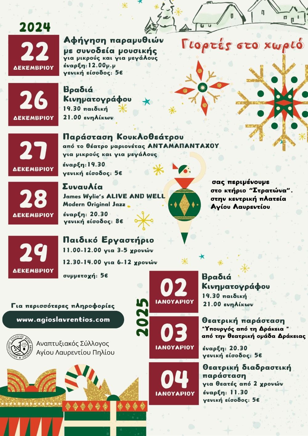 Πρόγραμμα πολιτιστικών δράσεων για τις γιορτές διοργανώνει ο Αναπτυξιακός Σύλλογος Αγίου Λαυρεντίου, με παραστάσεις, συναυλίες και κουκλοθέατρο. Αρχής γενομένης από την Κυριακή 22 Δεκεμβρίου στις 12 το μεσημέρι με αφήγηση παραμυθιού συνοδεία ζωντανής μουσικής.