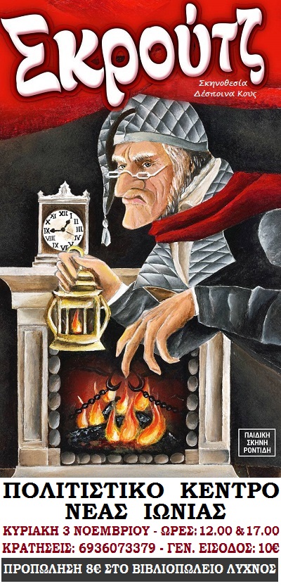 Στο Πολιτιστικό Κέντρο Ν. Ιωνίας θα παρουσιαστεί την Κυριακή 3 Νοεμβρίου η παιδική παράσταση Σκρουτζ με δύο παραστάσεις στις 12:00 και στις 17:00.