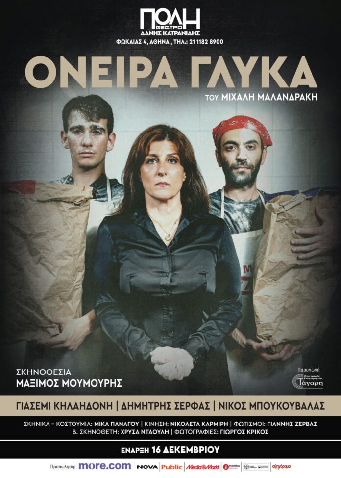 Μετά τη θερμή υποδοχή από κοινό και κριτικούς, το πρώτο θεατρικό κείμενο του ταλαντούχου συγγραφέα Μιχάλη Μαλανδράκη, «Όνειρα Γλυκά» ανεβαίνει για δεύτερη χρονιά, σε σκηνοθεσία Μάξιμου Μουμούρη.