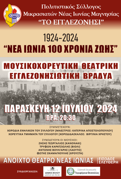 Ο Πολιτιστικός Σύλλογος Μικρασιατών Νέας Ιωνίας Μαγνησίας Το Εγγλεζονήσι σας προσκαλεί στην καθιερωμένη Εγγλεζονησιώτικη Βραδιά την Παρασκευή 12 Ιουλίου, ώρα 20.30 στο Δημοτικό Θερινό Θέατρο Νέας Ιωνίας με ελεύθερη είσοδο για το κοινό.