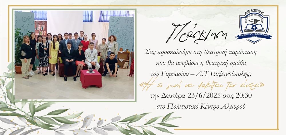 Την παράσταση του Γιώργου Τζαβέλλα, η δε γυνή να φοβάται τον άνδρα ανεβάζουν μαθητές του Γυμνασίου και Λ.Τ Ευξεινούπολης σήμερα Δευτέρα 23 Ιουνίου στις 8.30 το βράδυ στο πολιτιστικό κέντρο του Αλμυρού.