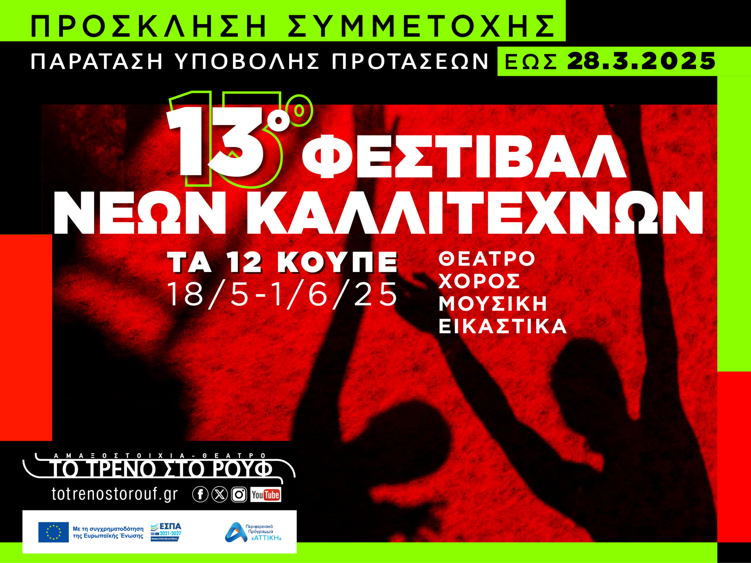 Το Φεστιβάλ Νέων Καλλιτεχνών «Τα 12 Κουπέ» για 13η χρονιά προσκαλεί νέους καλλιτέχνες από όλες τις μορφές της Τέχνης (Θέατρο, Μουσική, Χορός, Εικαστικά, Φωτογραφία, Κινηματογράφος, Video Art κ.ά.) να δημιουργήσουν performances σύντομης διάρκειας (10-30 λεπτών) και να τις παρουσιάσουν καθημερινά για δεκαπέντε μέρες από 18 Μαΐου έως 1 Ιουνίου 2025 στην Αμαξοστοιχία- Θέατρο το Τρένο στο Ρουφ.