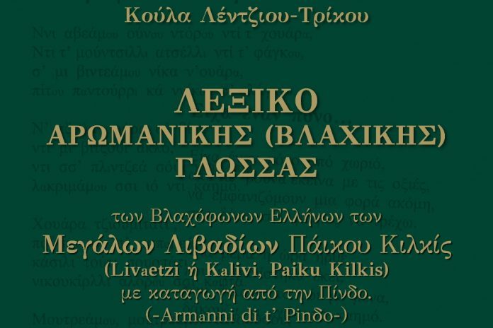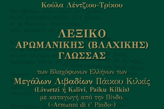 Ο Σύλλογος Περιβολιωτών Ν. Μαγνησίας και ο Δήμος Ρήγα Φεραίου, στο πλαίσιο των επετειακών εκδηλώσεων που διοργανώνονται, καθ’ όλη τη διάρκεια του έτους, με αφορμή την συμπλήρωση 40 χρόνων (1976-2016) από την ίδρυση του Συλλόγου , προγραμματίζει εκδήλωση/παρουσίαση του βιβλίου «Λεξικό Αρωμανικής (Βλάχικης) Γλώσσας» των βλαχόφωνων Ελλήνων των Μεγάλων Λιβαδίων Πάικου Κιλκίς, της δασκάλας Κούλας Λέντζιου-Τρίκου, που θα πραγματοποιηθεί την Κυριακή, 4 Δεκεμβρίου 2016, ώρα 10:30 π.μ. (αυστηρή τήρηση ώρας) στην Αίθουσα του Δημοτικού Συμβουλίου, στο Βελεστίνο.