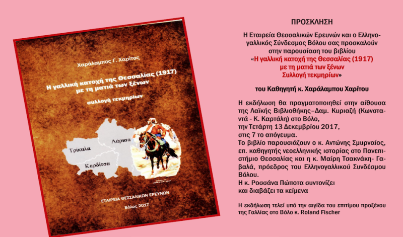 Η Εταιρεία Θεσσαλικών Ερευνών και ο Ελληνογαλλικός Σύνδεσμος Βόλου προγραμματίζουν την παρουσίαση του βιβλίου “Η γαλλική κατοχή της Θεσσαλίας (1917) με τη ματιά των ξένων. Συλλογή τεκμηρίων” του καθηγητή κ. Χαράλαμπου Χαρίτου.