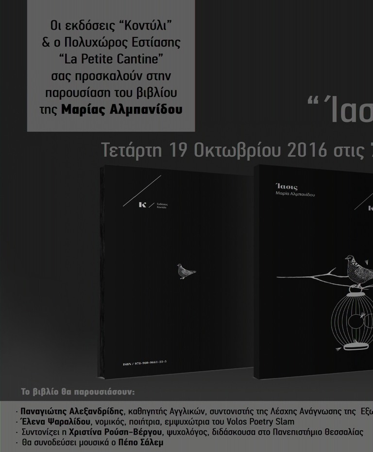 Την Τετάρτη 19 Οκτωβρίου 2016 στις 7 το απόγευμα θα παρουσιαστεί το βιβλίο της Μαρίας Αλμπανίδου ¨΄ΙΑΣΙΣ¨ από τις εκδόσεις Κοντύλι, στον Πολυχώρο Εστίασης La Petite Cantine (Πυράσσου 12, απέναντι από τις Καμάρες των ψαράδικων στα Παλαιά Βόλου).