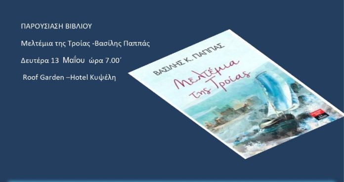 Παρουσίαση του βιβλίου « Μελτέμια της Τροίας» εκδ.Λιβάνη του Βασίλη Παππά θα πραγματοποιηθεί τη Δευτέρα 13 Μαΐου και ώρα 7.00΄στο Roof Garden της Κυψέλης στην παραλία του Βόλου. Προλογίζει η Άρτεμις Παπανδρέου –συγγραφέας.