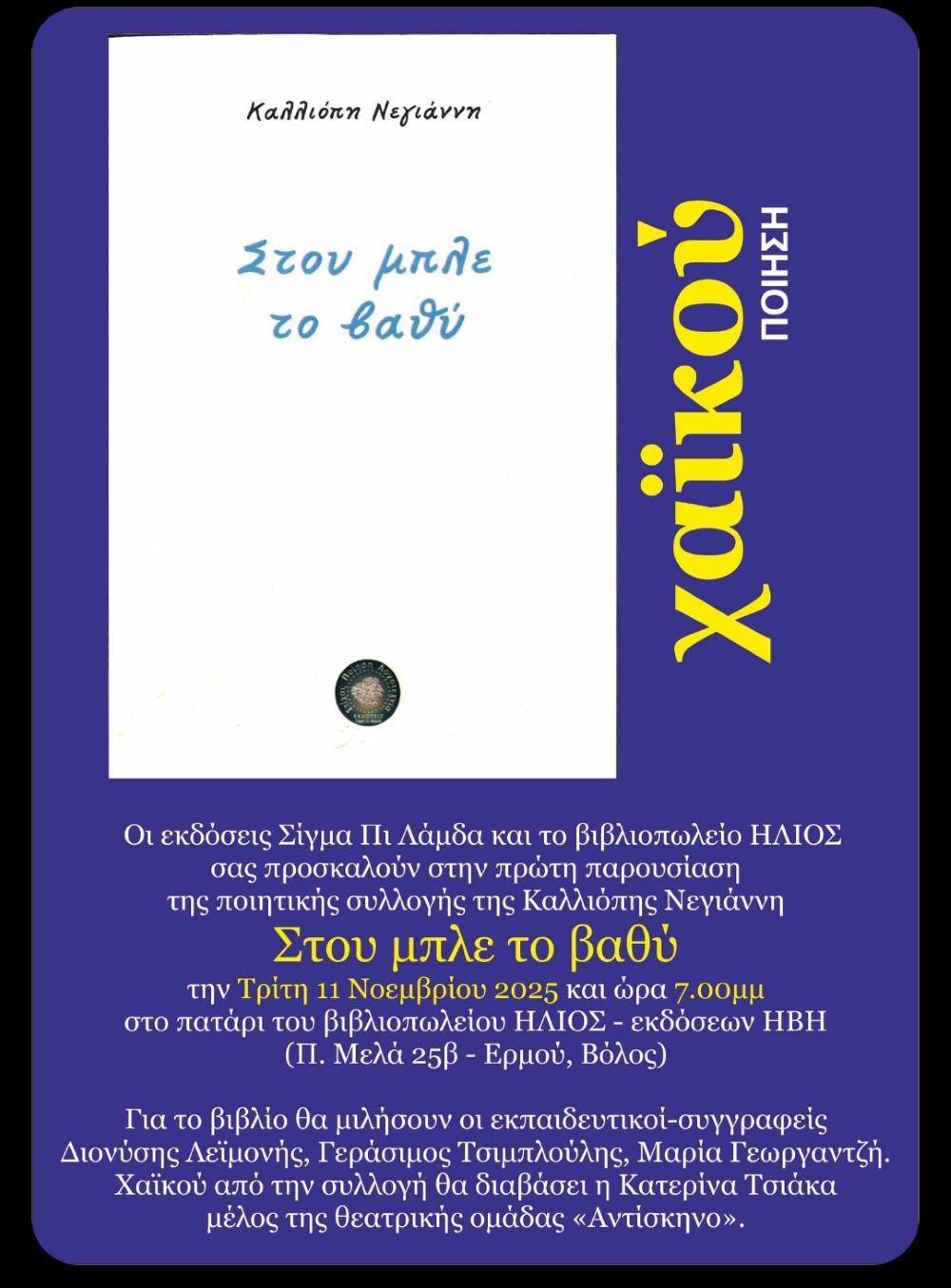 Οι εκδόσεις Σίγμα Πι Λάμδα και το βιβλιοπωλείο Ήλιος διοργανώνουν αύριο Τρίτη 11 Νοεμβρίου στις 7 το απόγευμα στο πατάρι του βιβλιοπωλείου την παρουσίαση της ποιητικής συλλογής της Καλλιόπης Νεγιάννη στου Μπλε το Βαθύ.