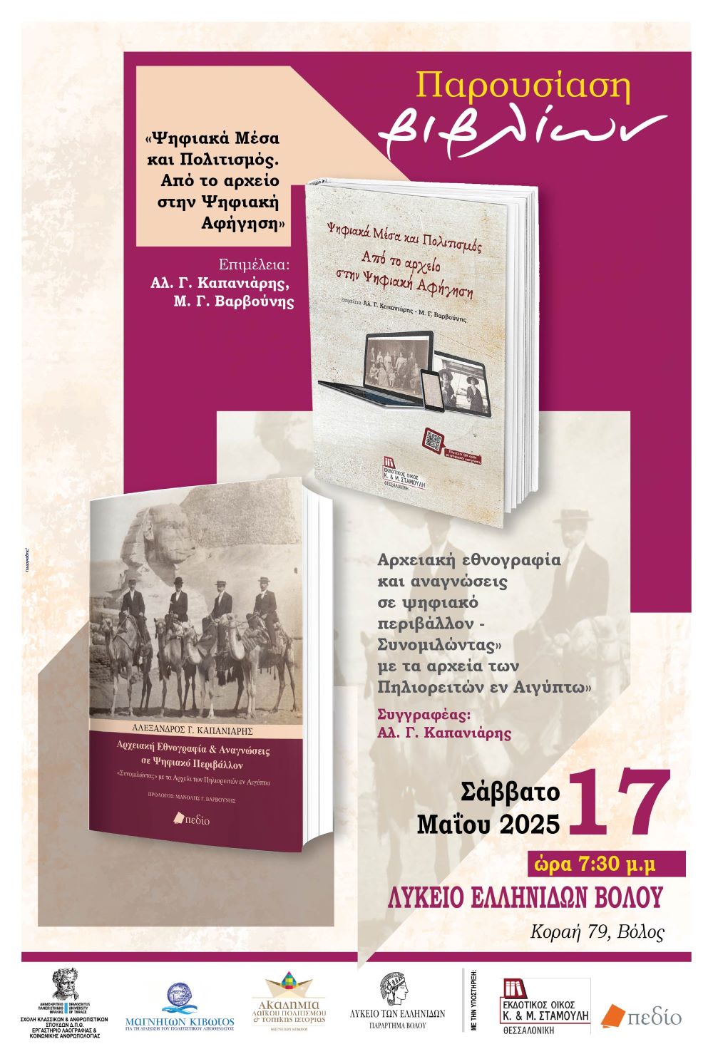 Το Σάββατο 17 Μάιου 2025 και ώρα 19:00 θα πραγματοποιηθεί η παρουσίαση των εκδόσεων «Ψηφιακά Μέσα και Πολιτισμός. Από το αρχείο στην Ψηφιακή Αφήγηση» και «Αρχειακή εθνογραφία και αναγνώσεις σε ψηφιακό περιβάλλον – Συνομιλώντας» με τα αρχεία των Πηλιορειτών εν Αιγύπτω», στο κτίριο Λύκειο Ελληνίδων Βόλου (Κοραή 79).