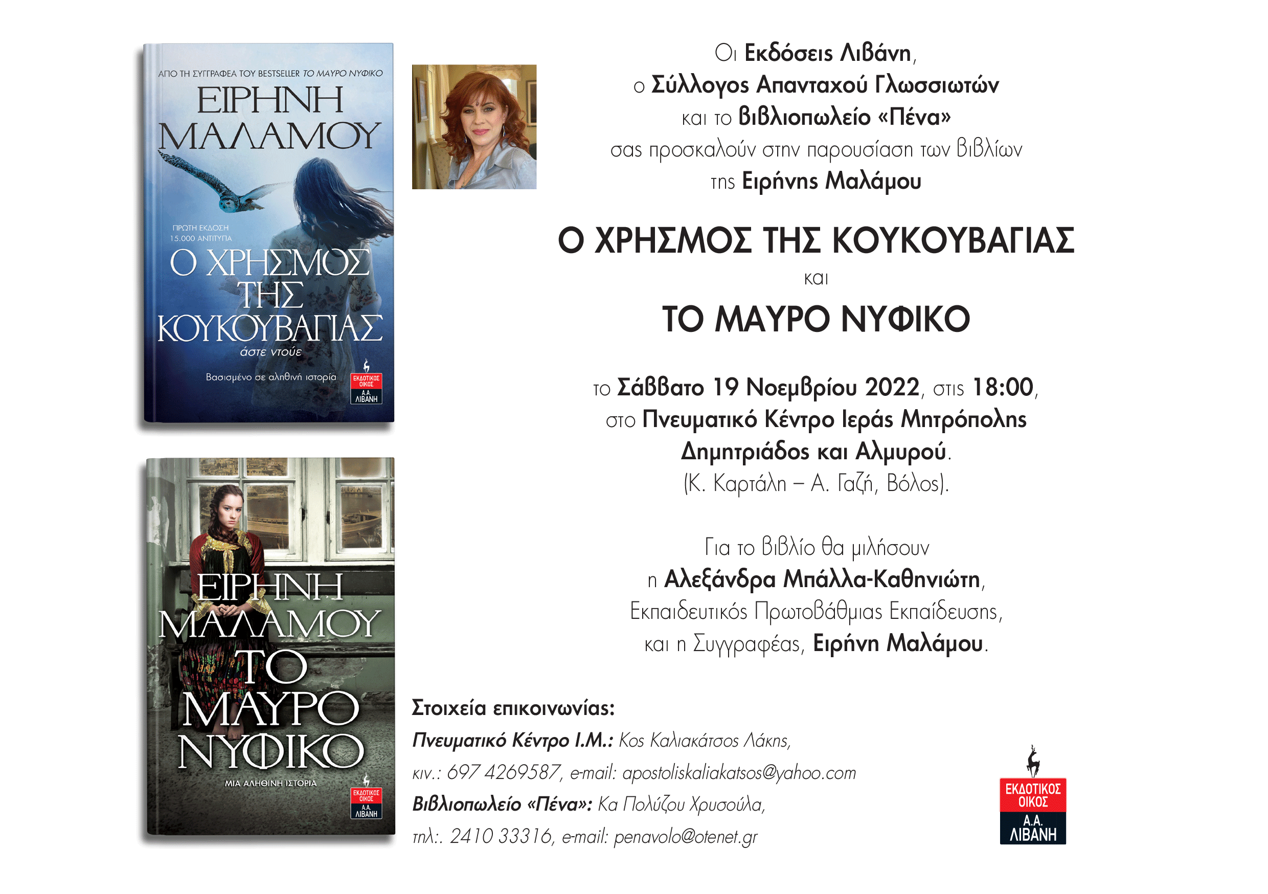 Οι Εκδόσεις Λιβάνη, ο Σύλλογος Απανταχού Γλωσσιωτών και το βιβλιοπωλείο «Πένα» σας προσκαλούν στην παρουσίαση των βιβλίων της Ειρήνης Μαλάµου «Ο Χρησμός της Κουκουβάγιας» και το «Μαύρο Νυφικό», το Σάββατο 19 Νοεµβρίου 2022, στις 18:00, στο Πνευµατικό Κέντρο Ιεράς Μητρόπολης Δηµητριάδος και Αλµυρού (Κ. Καρτάλη – Α. Γαζή, Βόλος). Για το βιβλίο θα µιλήσουν η Αλεξάνδρα Μπάλλα-Καθηνιώτη, Eκπαιδευτικός Πρωτοβάθµιας Εκπαίδευσης, και η Συγγραφέας, Ειρήνη Μαλάµου.