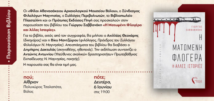 Το νέο βιβλίου του Γιώργου Σαββανάκη με τίτλο «Η Ματωμένη Φλογέρα και Άλλες Ιστορίες» παρουσιάζεται σήμερα στις 7.00 το απόγευμα στο «Αίθριον», στον πολυχώρο Τσαλαπάτα. Την εκδήλωση διοργανώνουν και μας προσκαλούν οι «Φίλοι Αθανασάκειου Αρχαιολογικού Μουσείου Βόλου», ο Σύνδεσμος Φιλολόγων Μαγνησίας, ο Σύλλογος Περιβολιωτών, το βιβλιοπωλείο Πλαστελίνη και οι Πρότυπες Εκδόσεις Πηγή.