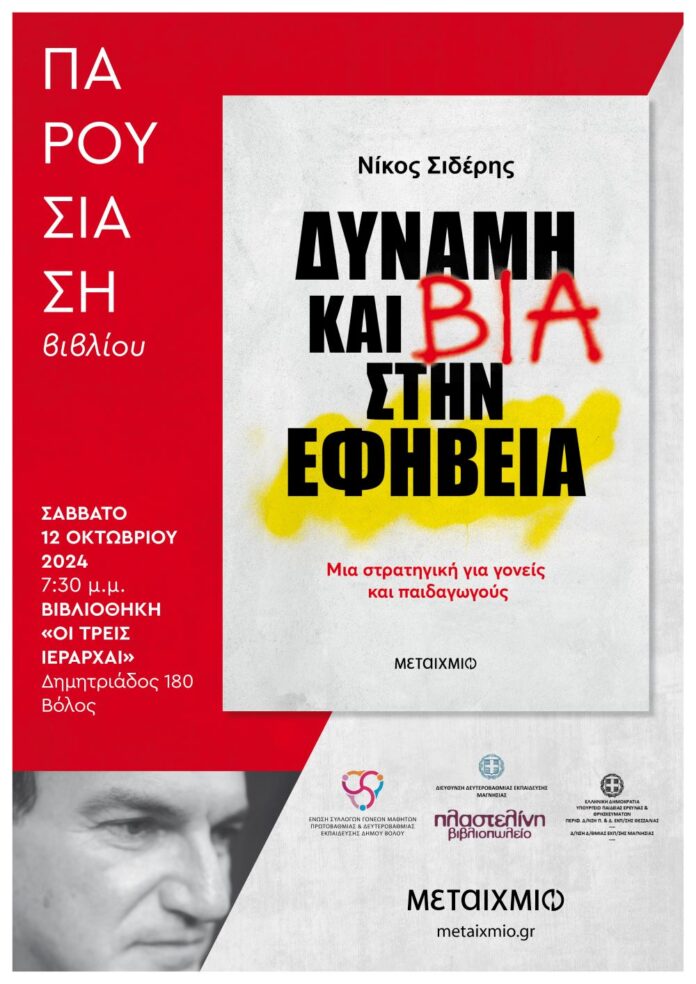 Το νέο βιβλίο του Νίκου Σιδέρη, με τον τίτλο: «Δύναμη και βία στην εφηβεία» παρουσιάζεται το ερχόμενο Σάββατο 12 Οκτωβρίου, με διοργανωτές τις Διευθύνσεις Πρωτοβάθμιας και Δευτεροβάθμιας Εκπαίδευσης, την Ένωση Συλλόγων Γονέων Μαθητών Πρωτοβάθμιας Δευτεροβάθμιας Εκπαίδευσης Δήμου Βόλου, το βιβλιοπωλείο πλαστελίνη και τις εκδόσεις Μεταίχμιο.