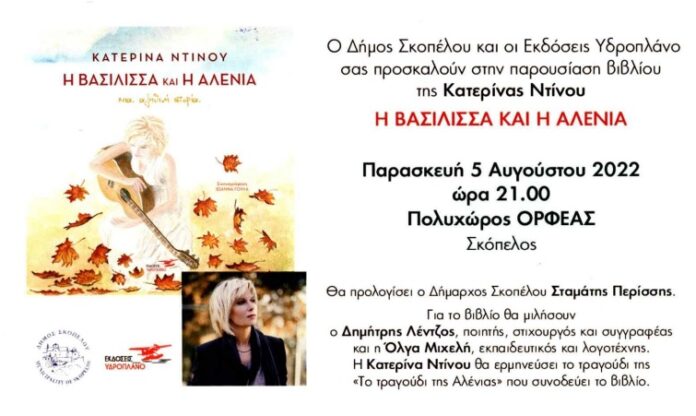 Ο Δήμος Σκοπέλου στο πλαίσιο της προαγωγής του πολιτισμού μέσα από την καλλιέργεια της φιλαναγνωσίας και σε συνεργασία με τις Εκδόσεις Υδροπλάνο, πραγματοποιεί την πρώτη πανελλαδική παρουσίαση του πρώτου βιβλίου της κ. Κατερίνας Ντίνου με τίτλο «Η Βασίλισσα και η Αλένια». Η εκδήλωση θα πραγματοποιηθεί την Παρασκευή 5 Αυγούστου και ώρα 21:00 στο κτήριο του «ΟΡΦΕΑ».
