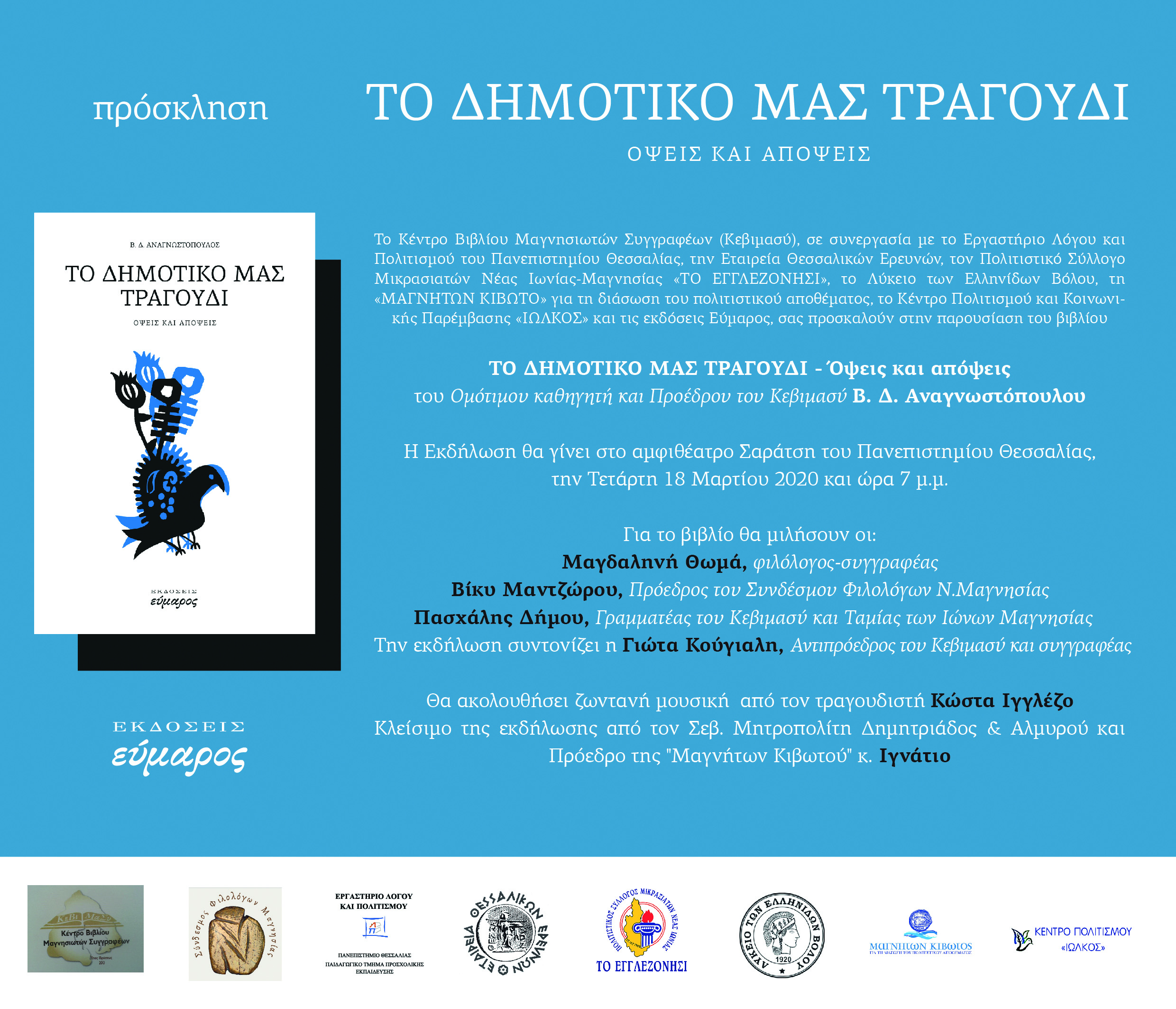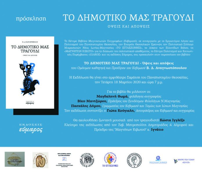 Παρουσίαση του βιβλίου «Το Δημοτικό μας Τραγούδι. Όψεις και Απόψεις» του Β.Δ. Αναγνωστόπουλου θα πραγματοποιηθεί στο αμφιθέατρο Σαράτση στις 18 Μαρτίου και ώρα 19.00. Για το βιβλίο θα μιλήσουν οι κ.κ. Μαγδαληνή Θωμά, Βίκυ Ματζώρου και Πασχάλης Δήμου.