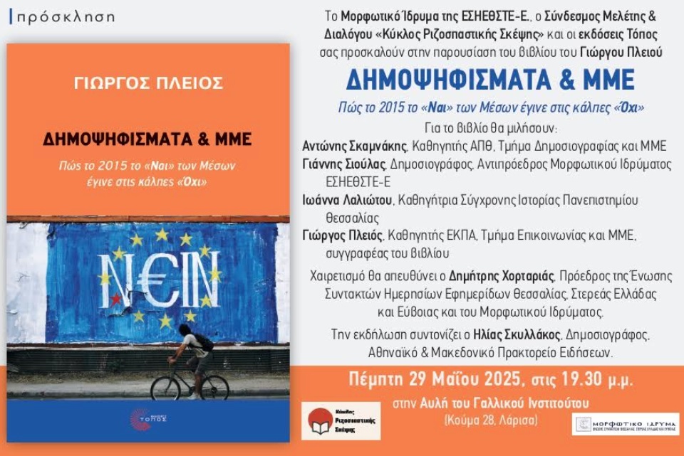 Το Μορφωτικό Ίδρυμα της ΕΣΗΕΘΣΤΕ-Ε, ο Σύνδεσμος Μελέτης & Διαλόγου «Κύκλος Ριζοσπαστικής Σκέψης» και οι εκδόσεις Τόπος, πραγματοποιούν στην αυλή του Γαλλικού Ινστιτούτου (Κούμα 28) – Λάρισα, την Πέμπτη 29 Μαΐου στις 19:30 στην παρουσίαση του βιβλίου του Γιώργου Πλειού «ΔΗΜΟΨΗΦΙΣΜΑΤΑ & ΜΜΕ – Πώς το 2015 το «Ναι» των Μέσων έγινε στις κάλπες «Όχι».