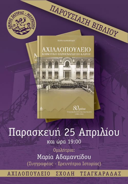 Παρουσιάζεται αύριο Παρασκευή 25 Απριλίου στις 7 το απόγευμα στην Αχιλλοπούλειο Εμπορική Σχολή Τσαγκαράδας το ιστορικό λεύκωμα της Μαρίας Αδαμαντίδου, με τίτλο «Αχιλλοπούλειο Κοινοτικό Παρθεναγωγείο Καΐρου: 80 χρόνια ελληνική εκπαίδευση στην Αίγυπτο (1884-1964)».