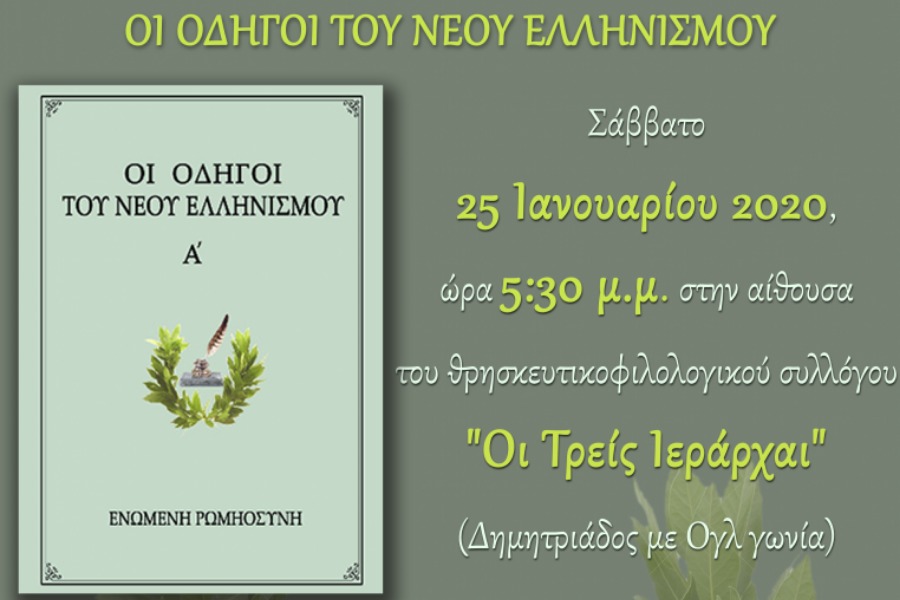 Το Σάββατο 25 Ιανουαρίου και ώρα 17.30 στην αίθουσα του θρησκευτικοφιλολογικού συλλόγου “Οι Τρείς Ιεράρχαι” (Δημητριάδος με Ογλ γωνία), θα γίνει η παρουσίαση του βιβλίου της Ενωμένης Ρωμηοσύνης “Οι Οδηγοί του Νέου Ελληνισμού” με ομιλητές δύο εκ των συγγραφέων του βιβλίου τον Διδ. Δημήτριο Καραμπερόπουλο Προέδρου της Επιστημονικής Εταιρείας Μελέτης Φερών-Βελεστίνου-Ρήγα και την κ. Ελένη Κουντουράκη διδ. Φιλολογίας του Πανεπιστημίου Αθηνών.